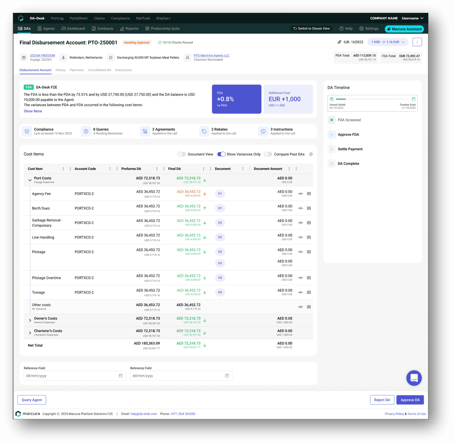 The DA Timeline brings the full financial lifecycle of a port call into a single chronological view: every PDA, FDA, query, follow-up, and screening event, in sequence, with predicted submission windows so operators can see what's coming rather than react to what's already late.