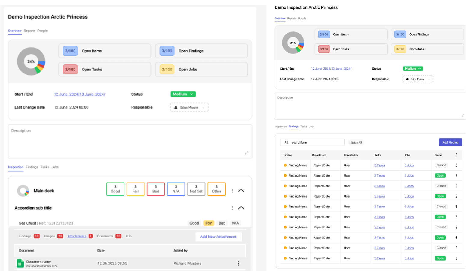 Inspection items, related images, comments, findings, and corrective actions are now displayed in a more structured and intuitive format.