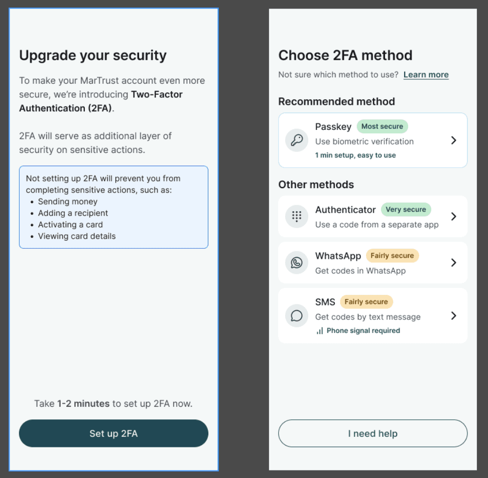 MarTrust has introduced an enhanced Two-Factor Authentication (2FA) experience across all crew accounts to provide stronger protection against fraud, account takeovers, and unauthorised access. Now rolling out to crew over the coming weeks.