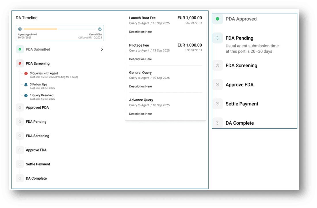 The DA-Desk Dashboard gives you a complete, real-time view of your port disbursement operations. It unifies financial and operational data into one place so you can monitor performance, spot delays early, and make faster, better decisions.