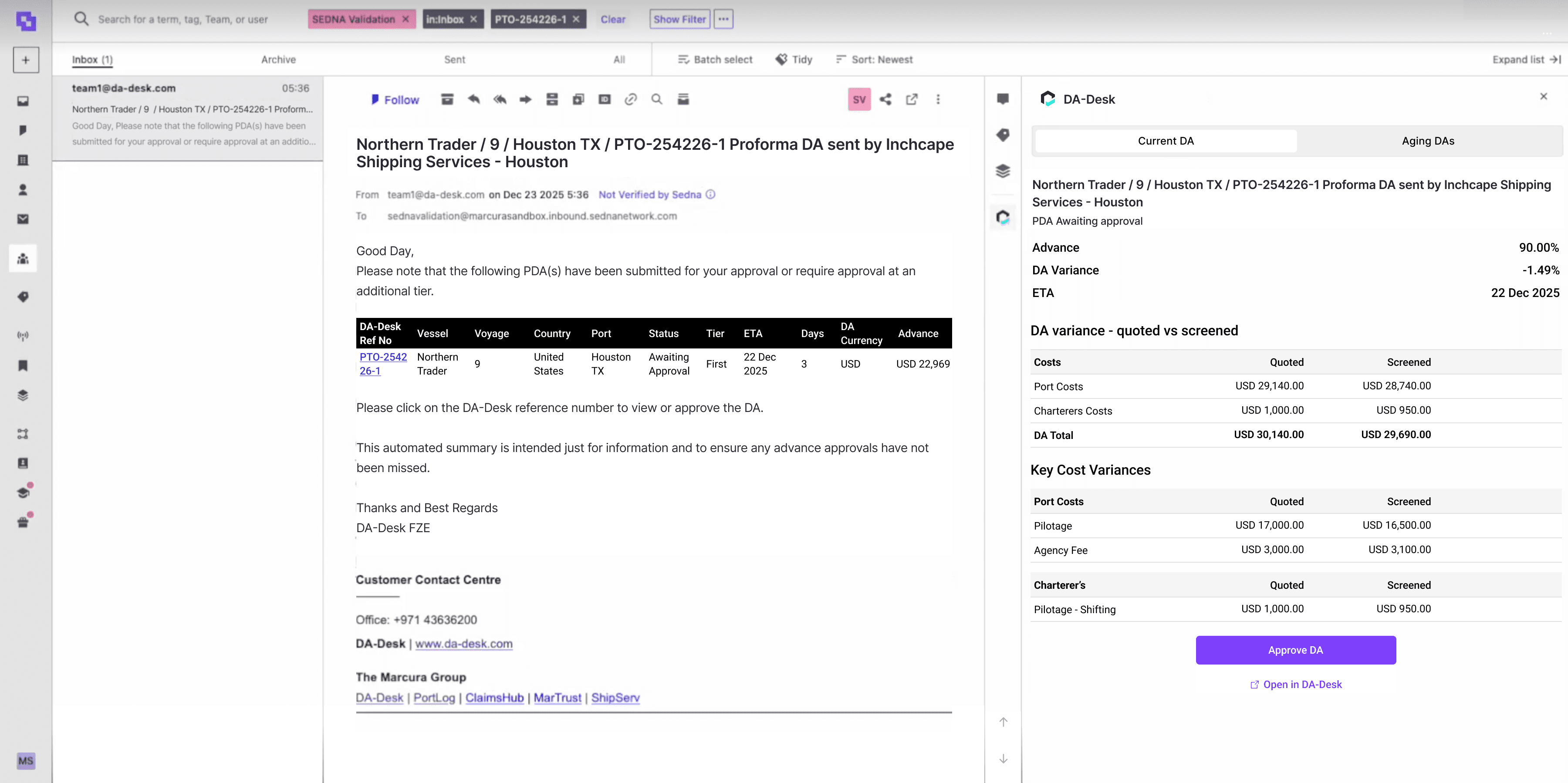 A seamless integration that enables reviewing and approving of PDAs and FDAs directly inside Sedna, with real-time synchronisation to DA-Desk for full workflow control and auditability.