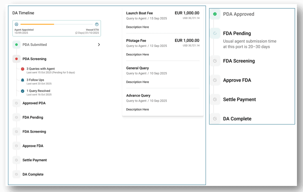 The DA Timeline brings all PDA, FDA, SDA, invoices, queries, and follow-ups into a single, chronological view.