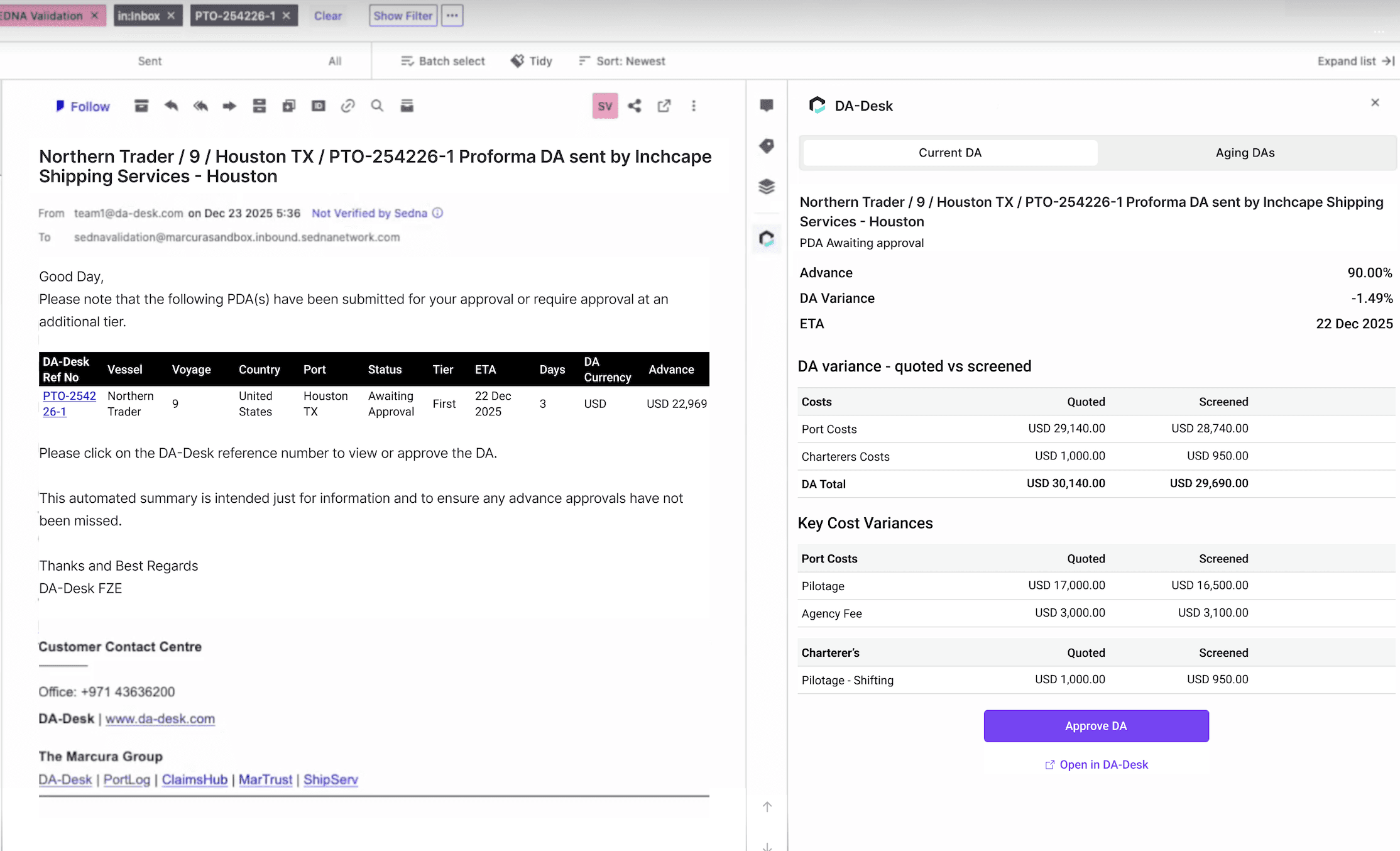 If your teams already work in Sedna to manage port call communication, this integration allows DA approvals to happen in the same place, without changing your DA-Desk workflows or controls.